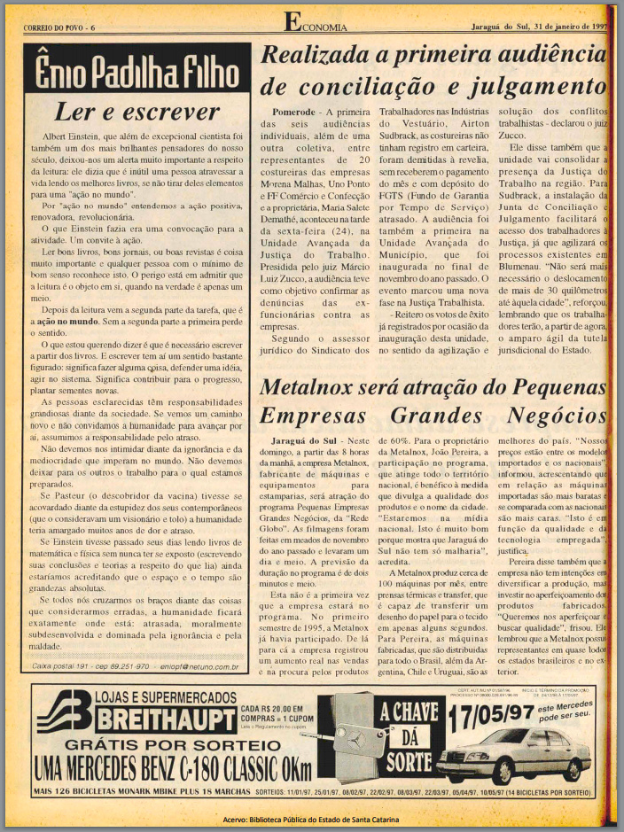 Um dos leitores dos meus artigos publicados em A NOTÍCIA era o jornalista Maurílio de Andrade. Ele era o editor do jornal Correio do Povo o mais importante semanário da região de Jaraguá do Sul, a cidade onde nós moramos entre 1992 e 1999. Então, em janeiro de 1997 ele me convidou para um café, conversamos sobre muitos assuntos, como fazíamos sempre e, no fim da conversa ele perguntou se eu não toparia escrever uma coluna no jornal, sobre temas gerais, no mesmo estilo dos artigos publicados em A Notícia.