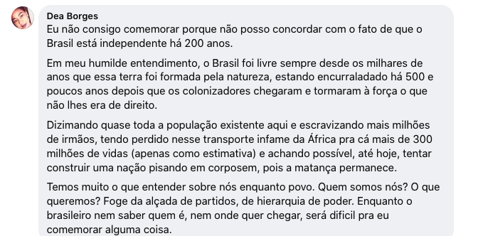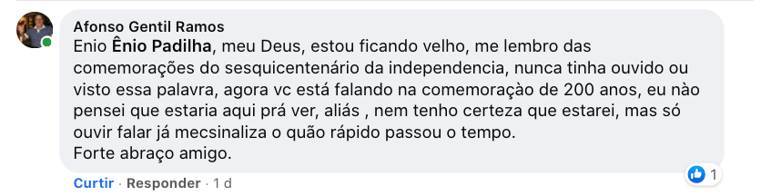 Em setembro de 2022 (se Deus quiser) estaremos em plena campanha eleitoral. Não deixe que a comemoração dos 200 anos da Independência vire tópico de campanha de nenhum candidato. Já perdemos a liberdade de usar roupas vermelhas ou amarelas. Já perdemos o direito de usar a nossa bandeira ou a camisa da nossa seleção de futebol, sem ser associado aos grupos de extrema esquerda ou estrema direita. Chega!