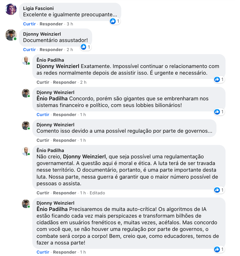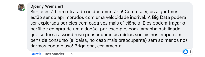 Análise corretíssima, meu amigo Alberto Costa. Quando eu li o livro CHATÔ, O REI DO BRASIL (a biografia do Assis Chateaubriand, imperador da mídia brasileira, antes da era Globo) eu escrevi num artigo que aquele livro ensinava o leitor a ler jornais. Creio que este documentário do Jeff Orlowski tem o mesmo efeito. Nos ensina a lidar com as redes sociais. |