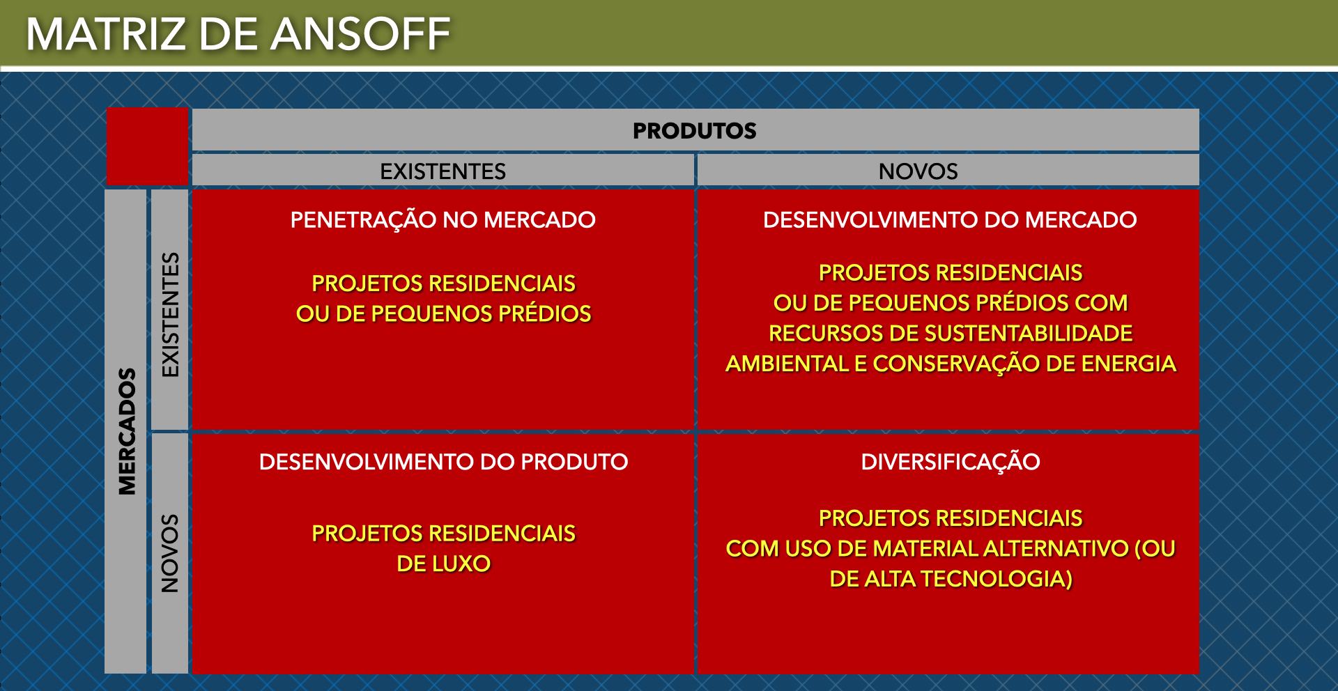 No caso de escritórios de Engenharia ou de Arquitetura, teríamos os seguintes exemplos para a Matriz de Ansoff: