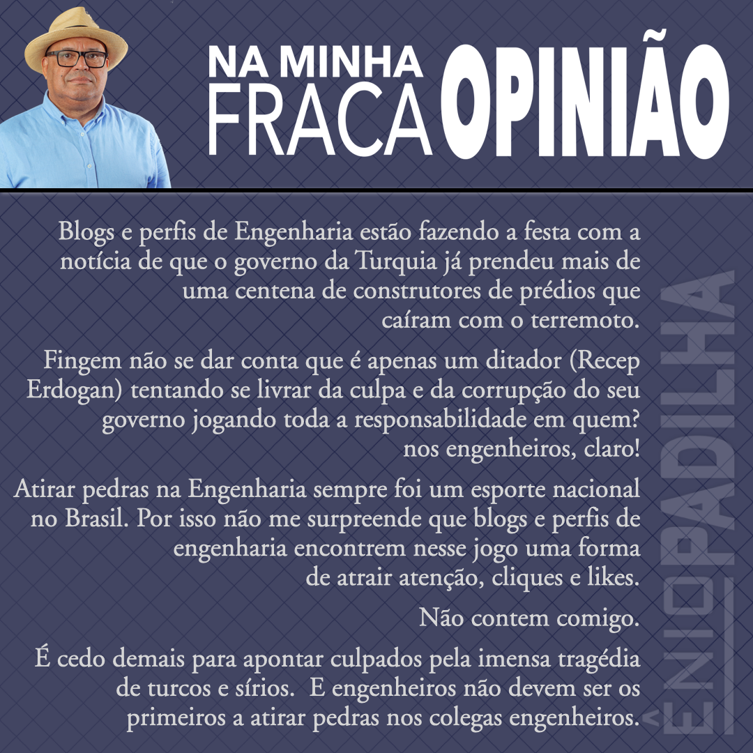 (Publicado em 13/02/2023) Leia também: NO FIM, A CULPA É DO ENGENHEIRO! Pedreiros, carpinteiros, armadores, encanadores, eletricistas, carregadores, ninguém, absolutamente ninguém, além do engenheiro tem responsabilidade sobre o que acontece numa obra. É tudo responsabilidade do Engenheiro. É tudo Culpa do Engenheiro!