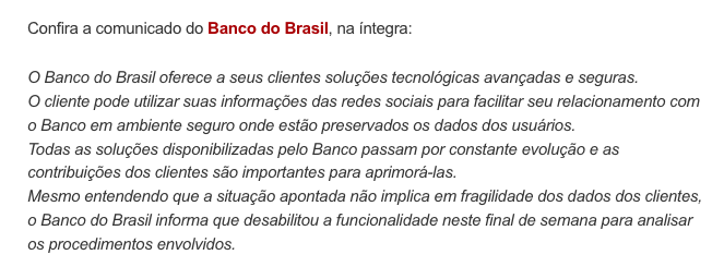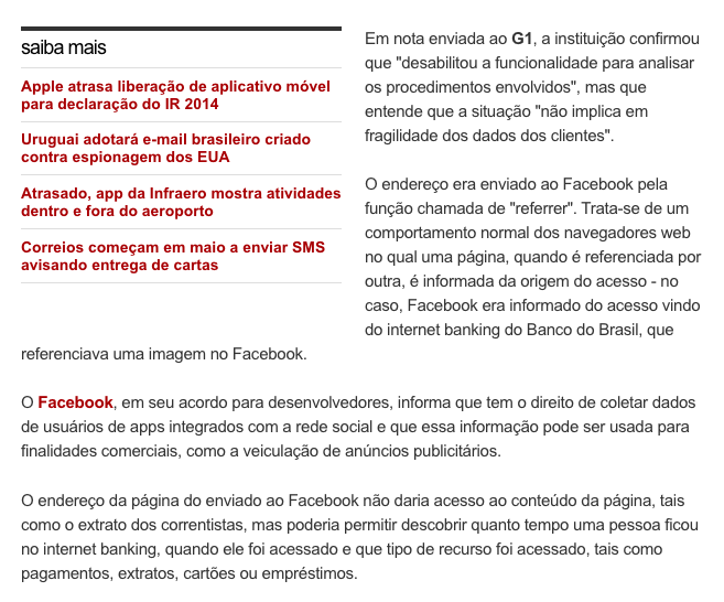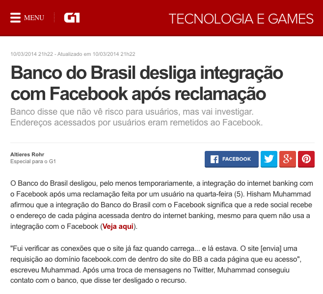 O FACEBOOK FAZ MUITO BEM O MAL QUE NOS FAZ (Publicado em 01/05/2014) Há algumas semanas li a notícia de que o Banco do Brasil desativou a integração que havia feito entre o seu internet bank com o Facebook. Isso depois que um cliente descobriu os detalhes dessa integração e o risco a que os clientes do banco estavam expostos. (veja ABAIXO) Algumas pessoas são mais espertas e, ao entrar mantém consigo a chave da porta da saida. E desfrutam das outras maravilhas da internet quando querem. Mas algumas quando entram no Facebook, devolvem a chave da saída para o mestre Zuck (o grande irmão) e nunca mais saem de lá. Aí, se o Banco do Brasil quer fazer contato com elas é preciso ter agências lá no cercadinho. Que coisa triste! PADILHA, Ênio. 2014 |