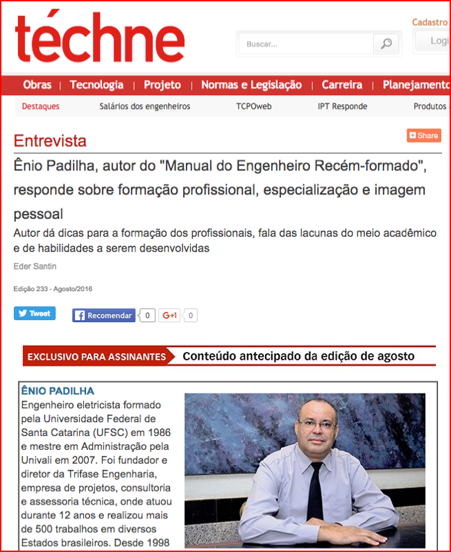 A edição nº 233 - Agosto de 2016 - da REVISTA TECHNE (a mais importante revista da Engenharia brasileira) traz uma longa entrevista comigo.